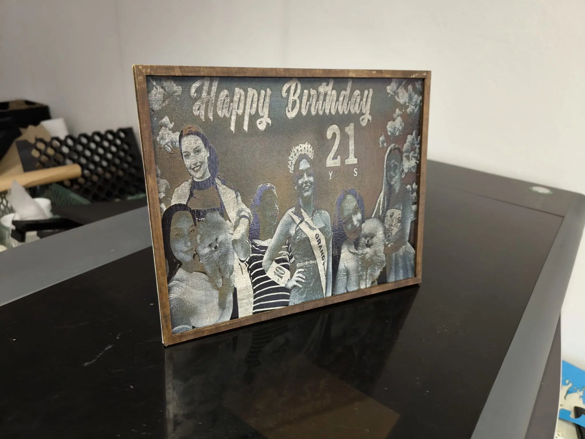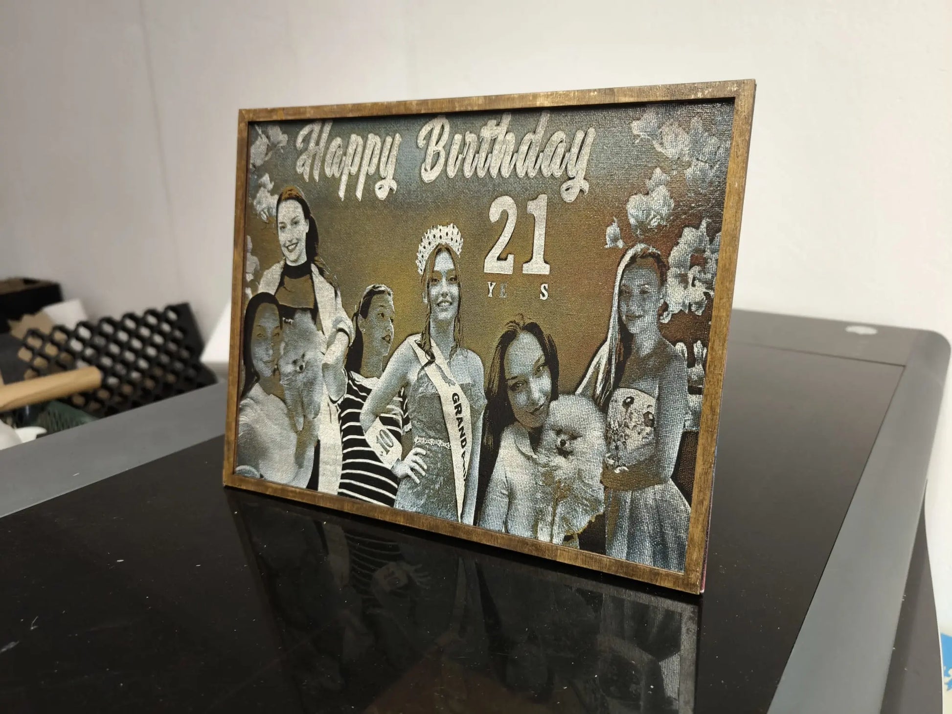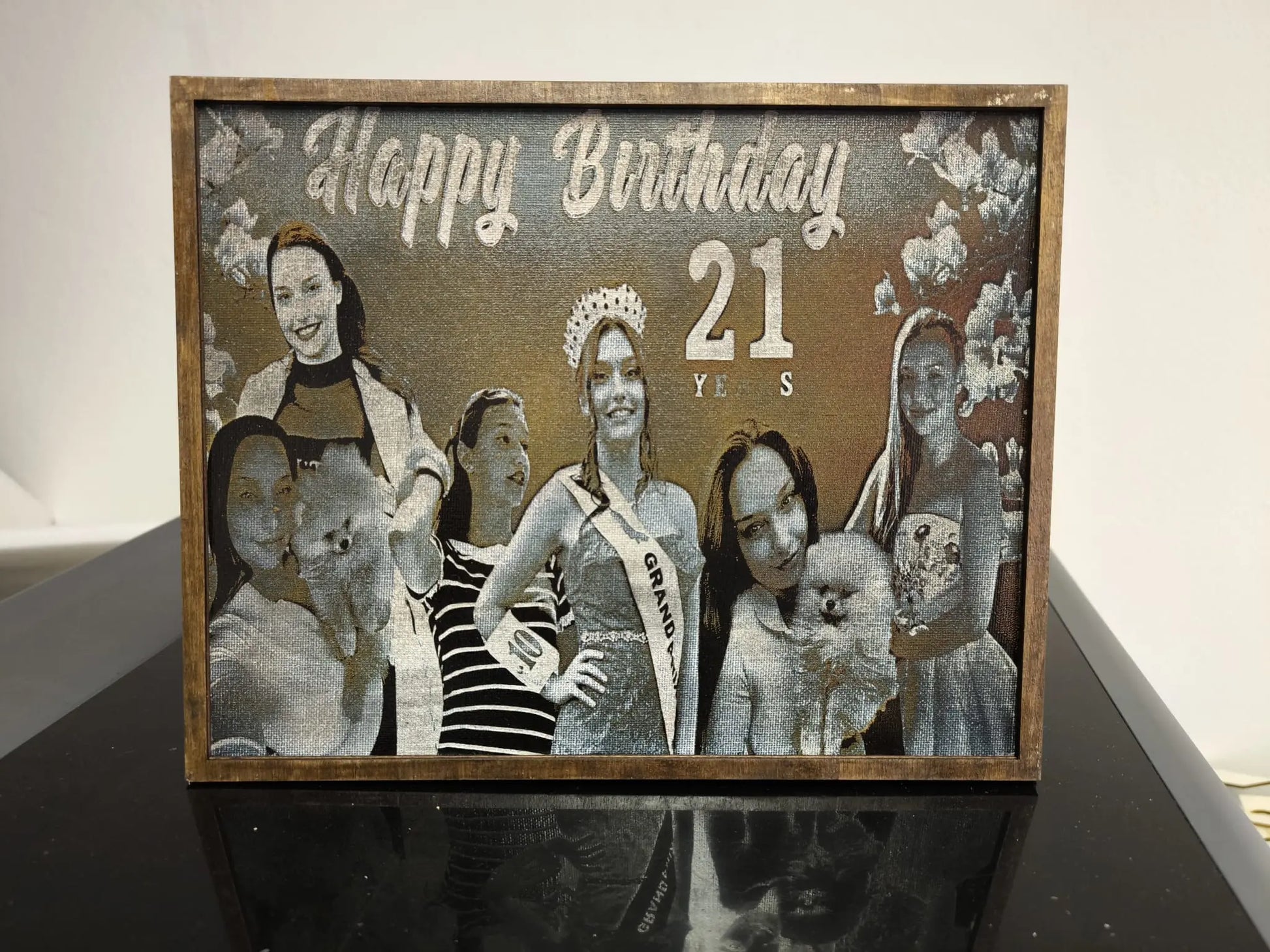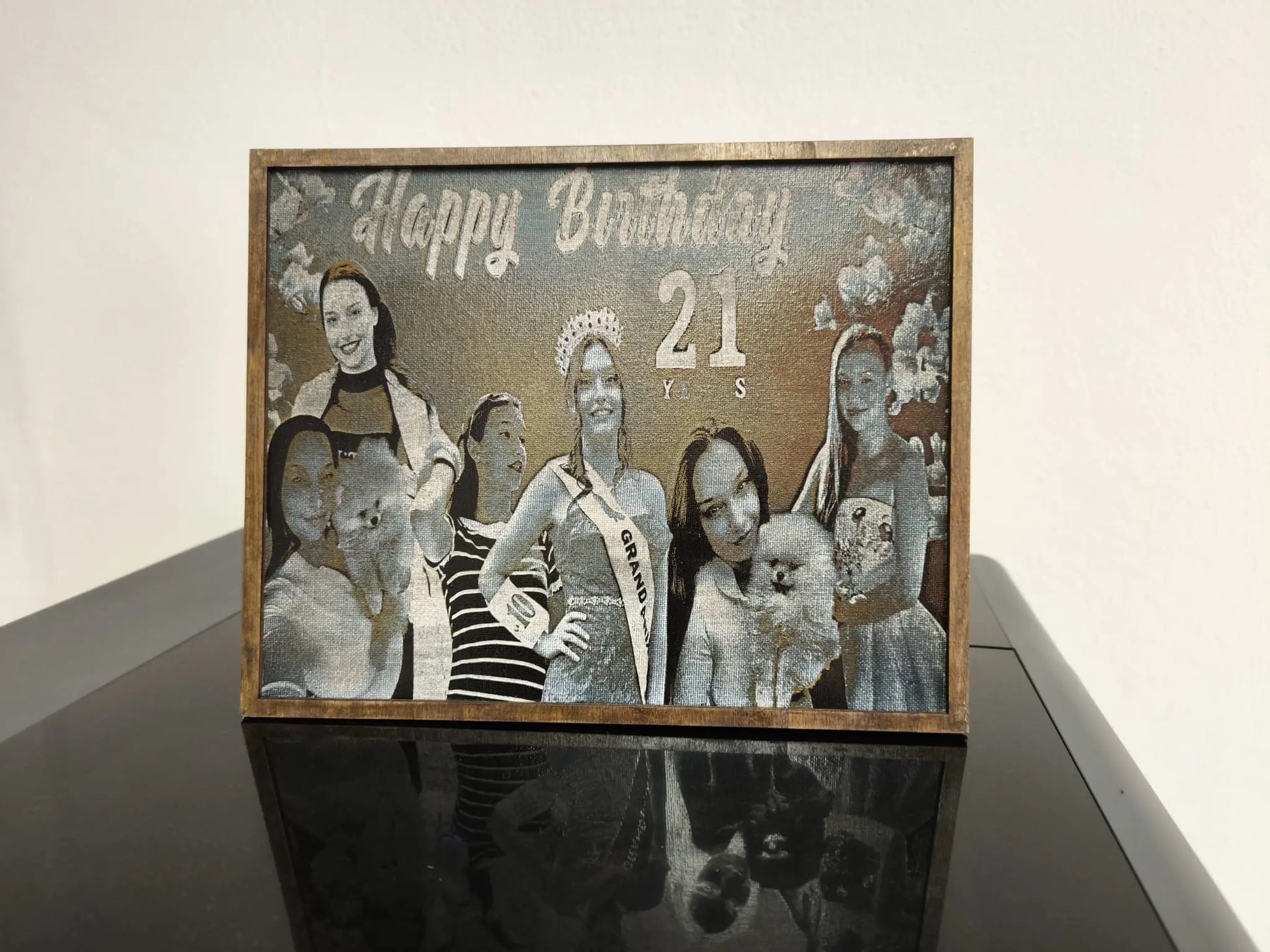 Dein Lieblingsfoto wird auf eine handbemalte Leinwand (30 × 24 cm) graviert – mit modernster Lasertechnik & handaufgetragenen Farben (Weiß, Gelb, Rot, Blau, Schwarz).