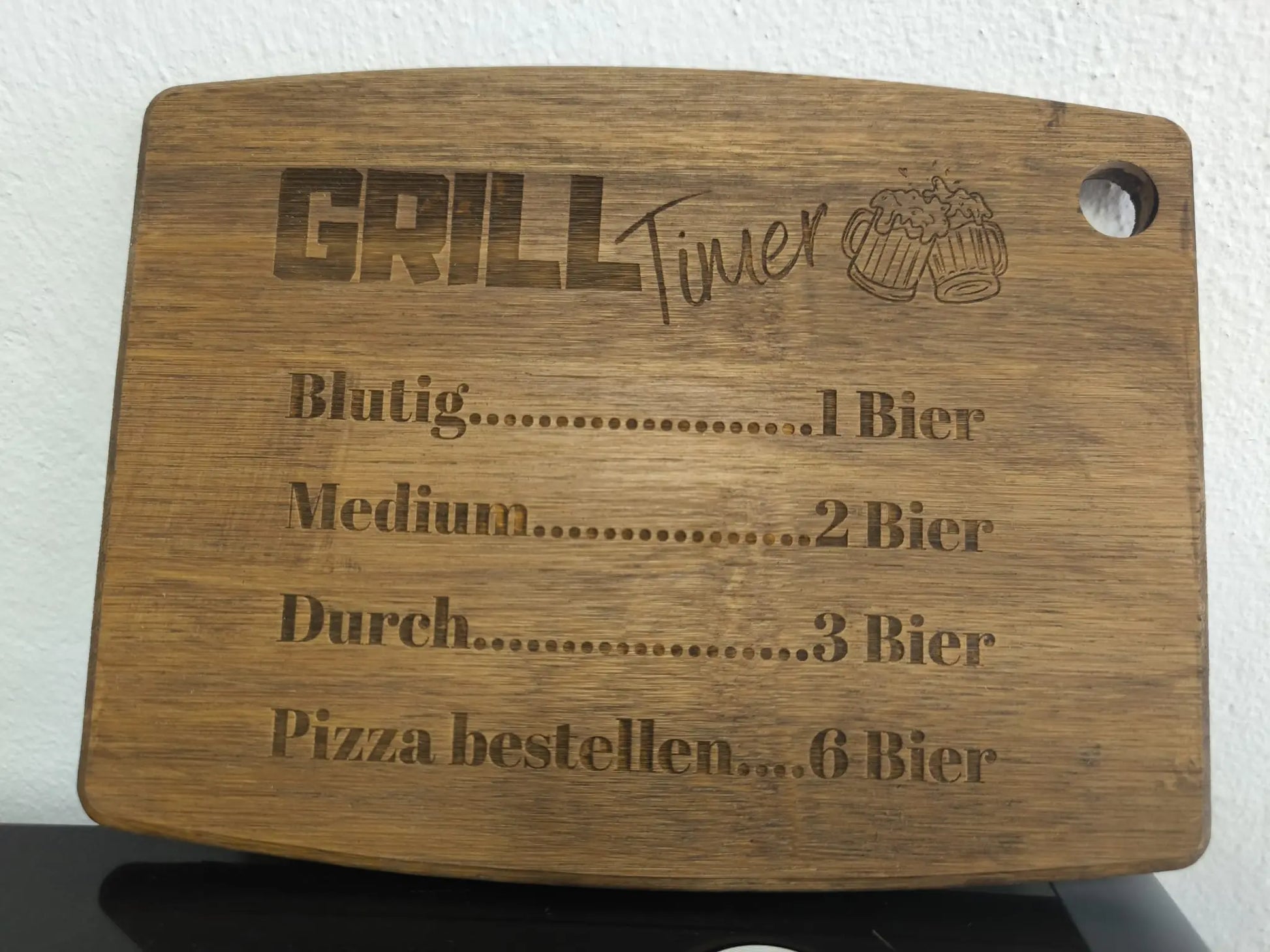 Unser Graviertes Schneidebrett „Grill Timer“ ist der ultimative Spaß für jede Grillparty. Mit dem witzigen Bier-Timer entscheidest du, ob dein Steak „blutig“, „medium“ oder „durch“ wird – oder ob du lieber Pizza bestellst! Graviert auf stabilem, nachhaltigem Bambusholz, robust & pflegeleicht.